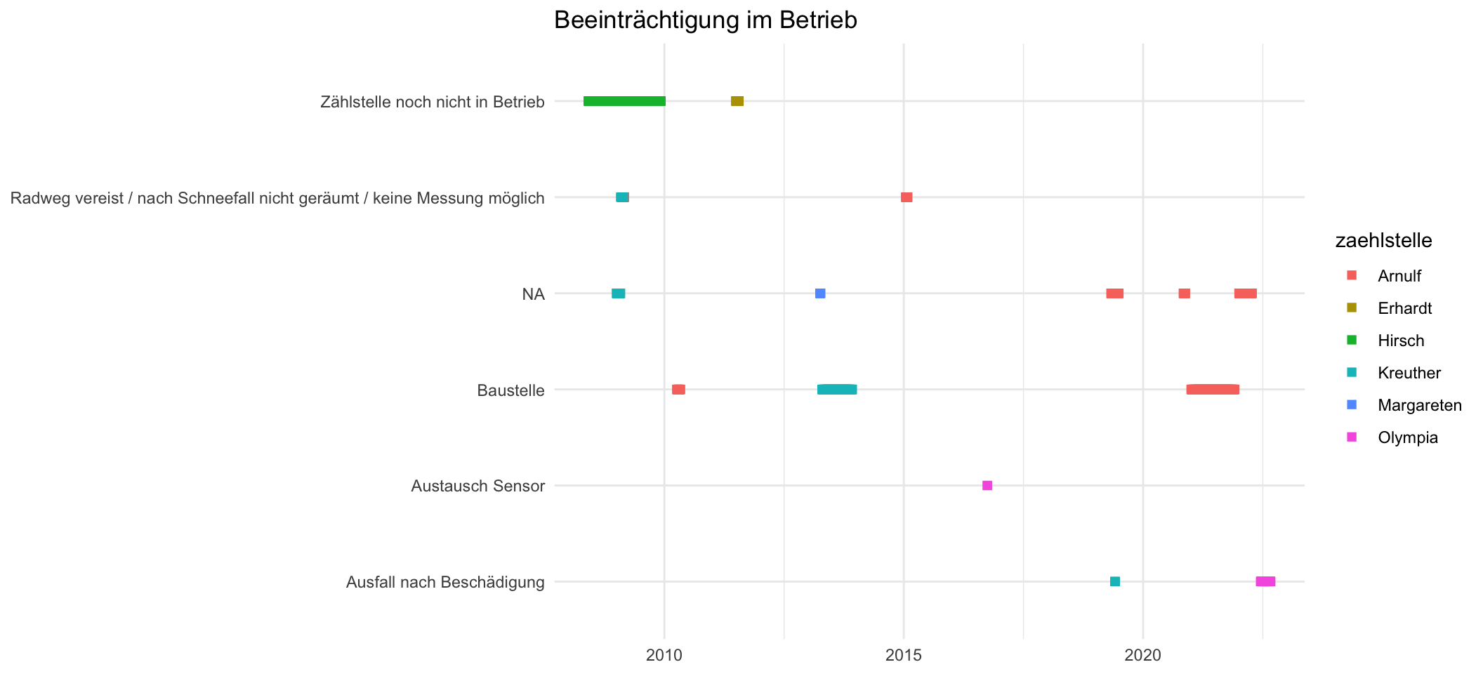 Unter den Beeinträchtigungen finden sich verschiedene Klassifikationen, wobei “Zählstelle noch nicht in Betrieb” und “Baustelle” die häufigsten beeinträchtigungs Gründe darstellen. Für 10% der Beeinträchtigung gibt es keine Klassifizierung.