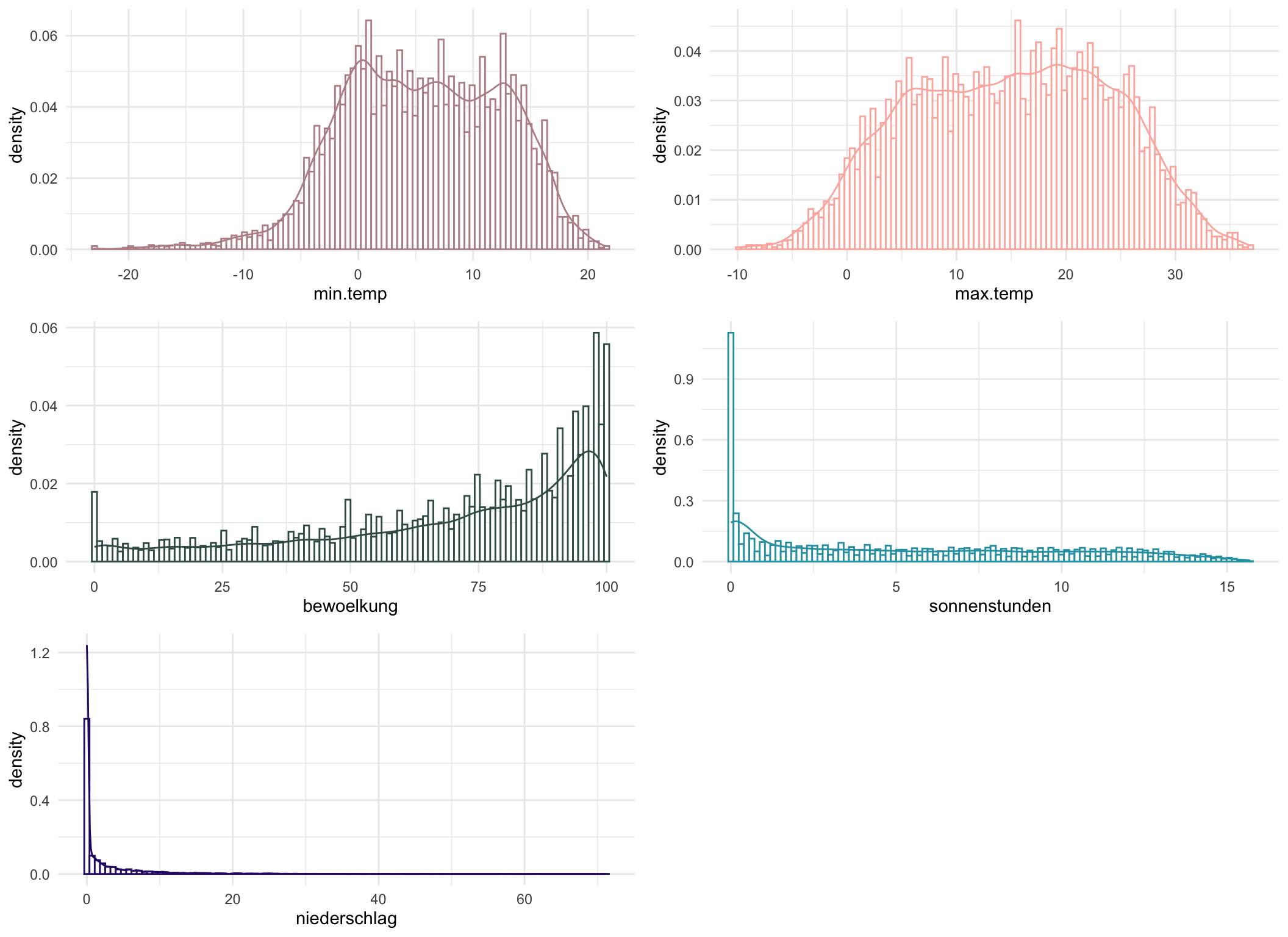 Die Jahreszeiten scheinen stark mit der Tagesaktivität in Verbindung zu stehen. Um dies genauer zu untersuchen ist es sinnvoll sich die Verteilung Wetter-Variablen genauer anzuschauen.