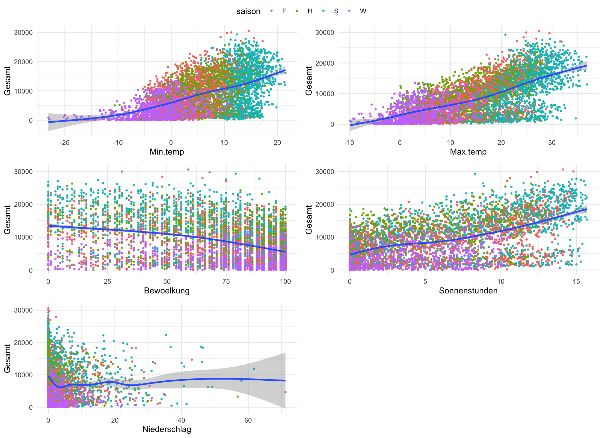 select(gesamt, min.temp, max.temp, niederschlag, bewoelkung, sonnenstunden, saison) %>%