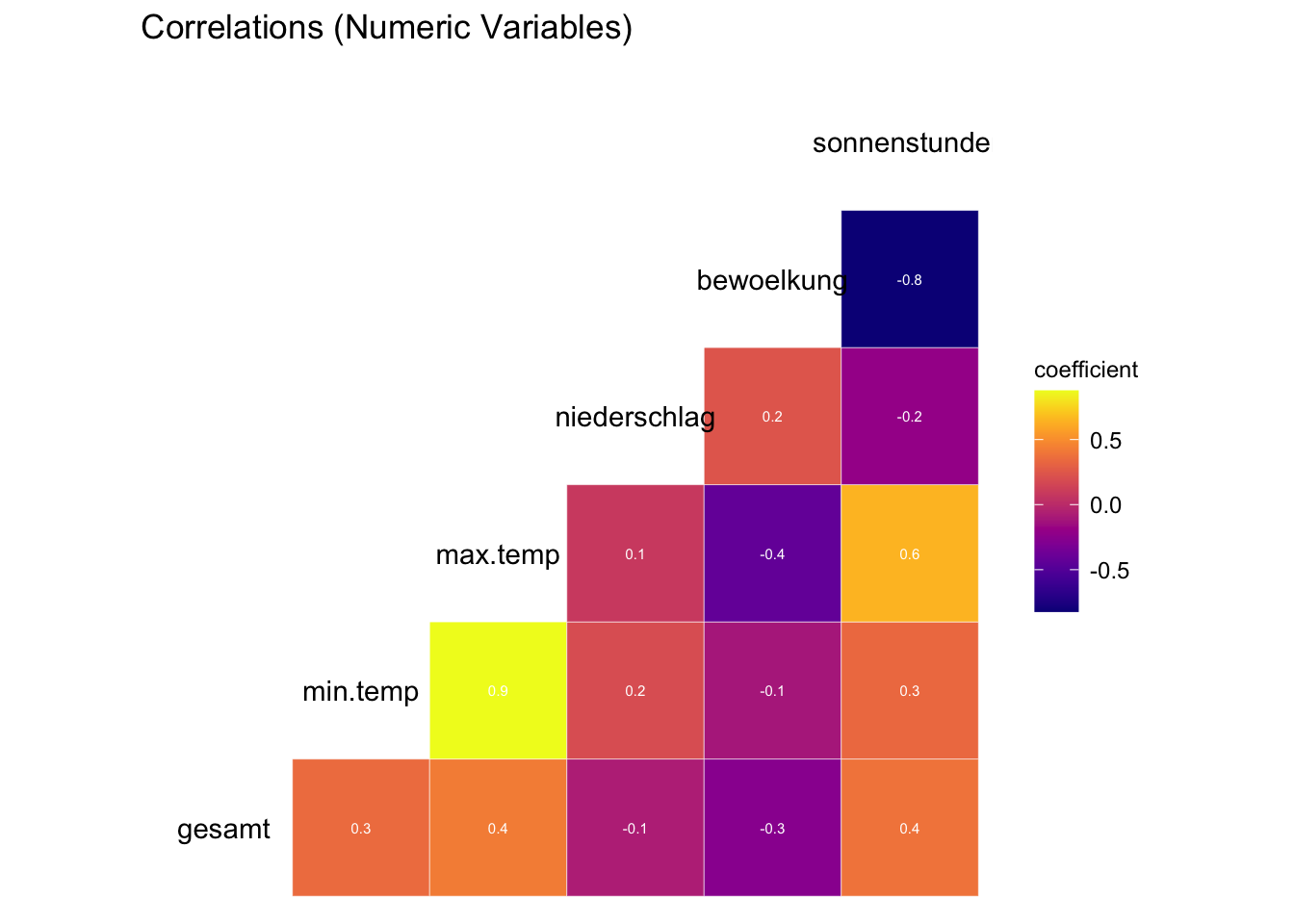 Wir sehen, dass min.temp und max.temp stark korreliert sind. Da wir keine zu starken Korrelationen zwischen unseren Features haben wollen, sollten wir eine dieser Variablen beim modellieren entfernen.
