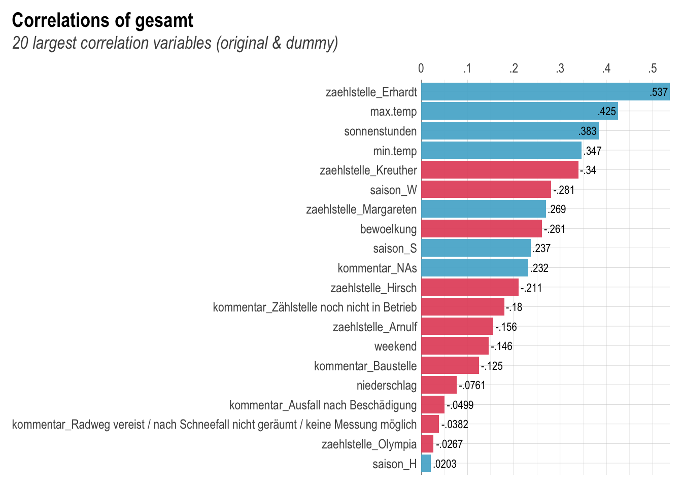 Interessant ist besonders, welche Variablen in welchem Grad zum Aktivitätsvolumen beitragen. Die obige Grafik zeigt auf, dass die Zählstelle Erhardt den größten positiven Impakt auf die Aktivität hat. max.temp und sonnenstunden sind ebenfalls sehr wichtig. Wenn die Aktivität in der Zählstelle Kreuther gemessen wurde, dann ist die Chance relativ groß, dass die Aktivität nicht besonders hoch ausgefallen ist.