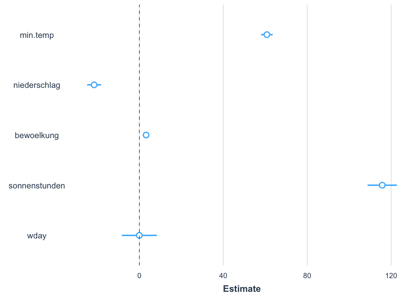 model <- lm(gesamt ~ min.temp + niederschlag + bewoelkung + sonnenstunden + wday, data = data )plot_summs(model)