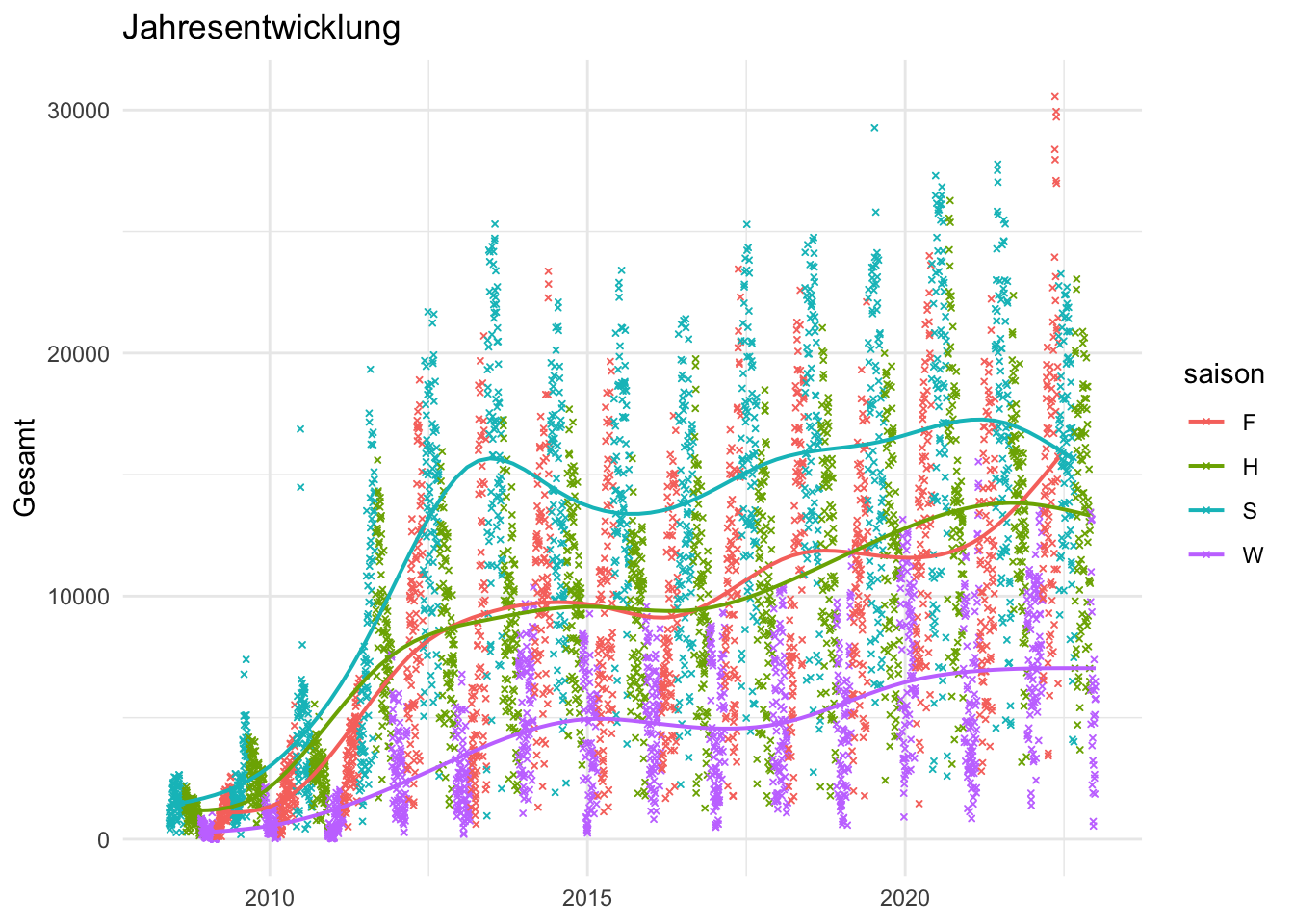 ggplot(aes(x = datum, y = Gesamt, color = saison)) +