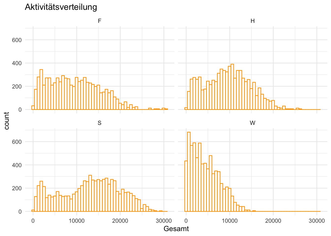 Die obige Grafik beschreibt die Verteilung der Aktivität nach Jahreszeit. Für die wärmeren Jahreszeiten ist die Verteilung etwas gestreckter, was bedeutet, dass es in ähnlichem Maße Tage mit viel aber auch wenig Aktivität gibt. Im Winter ist das Profil rechtsschief. D.h. dass es viele Tage gibt, an welchen keine oder wenig Aktivität bei Zählstationen gemessen wurde.
