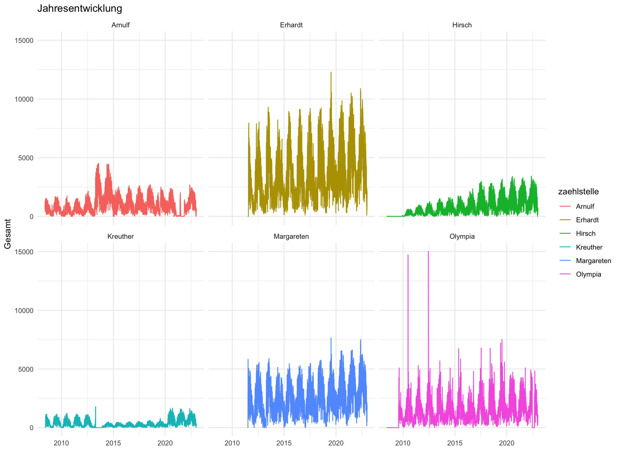 Ebenfalls interessant sind Ausreißer wie etwa bei der Zählstation Olympia (zwischen den Jahren 2012 und 2015). Diese sind vermutlich durch das 24h Mountain Bike Rennen im Olympia Park erzeugt worden (Eine Analyse dazu findet sich in SOMTOMS Blog).