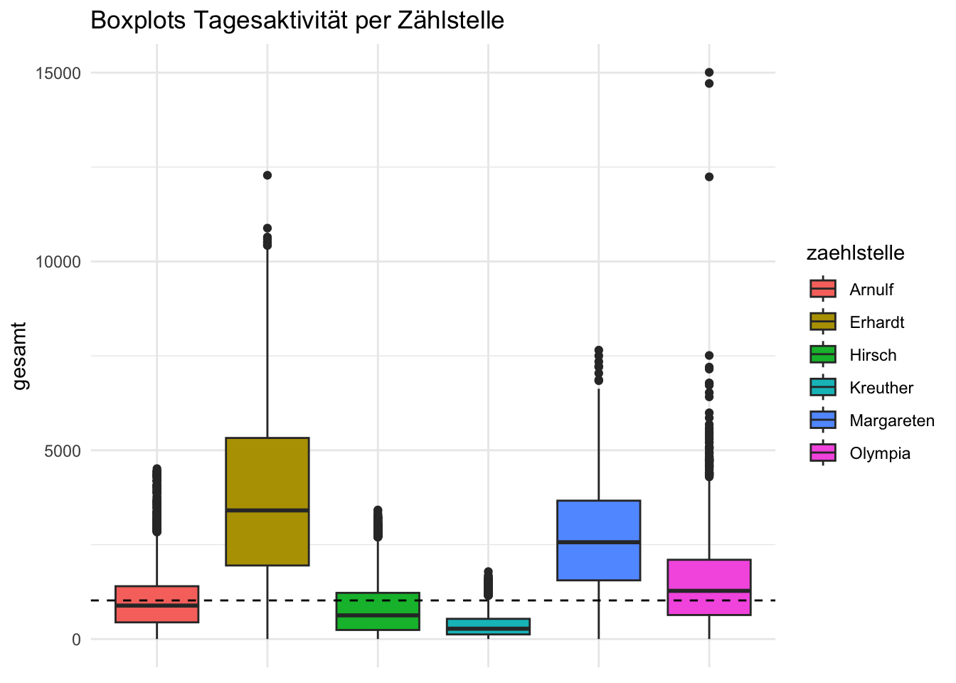 Das Gesamtaktivitätsprofil lässt sich auch gut mit Boxplots darstellen. Die horizontal schraffierte Linie stellt den Gesamtmedian dar. Erhardt und Margareten sind die Stationen mit der höchsten Aktivität, deren Aktivität deutlich über dem Populationsmedian liegt.