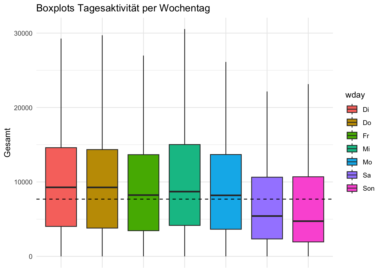 ggtitle("Boxplots Tagesaktivität per Wochentag")