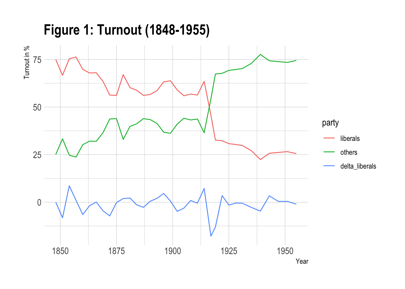 ggtitle("Figure 1: Turnout (1848-1955)") +