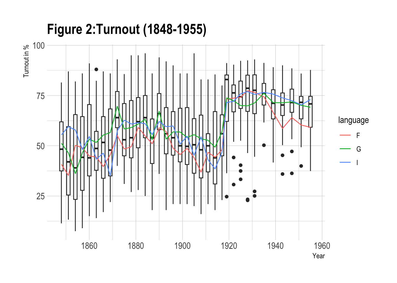 Figure 2 depicts boxplots per election term for turnout within the period 1848-1955. Striking is the transition between 1917 and 1919 where electoral participation increased significantly throughout all language regions. Also, after 1919 there seems to be an increased number of outlier cantons which experienced significantly lower turnout results than the majority. Noticeable is also that voter turnout in French-speaking regions is almost always lower compared to the German ones. Italian speaking regions lie mostly in between.