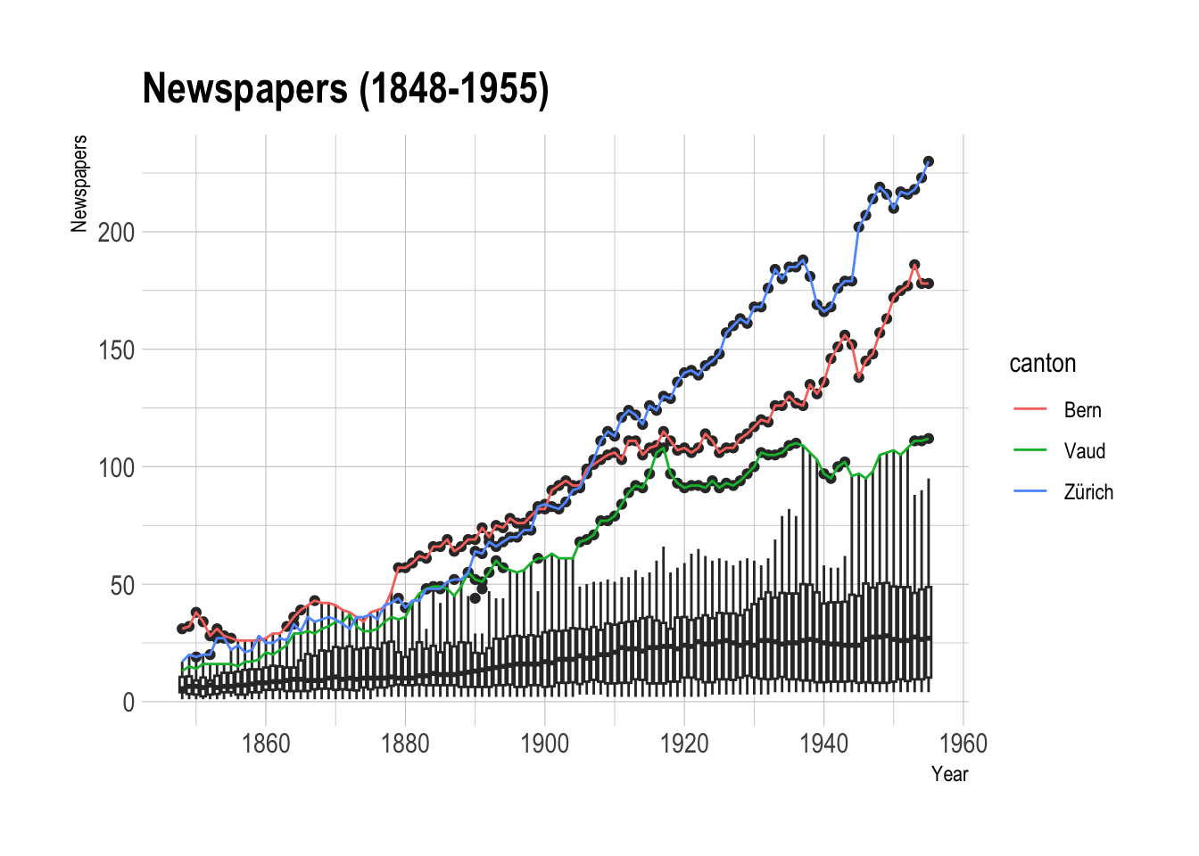 The development of the press went along the rise of the bourgeoise in the 19th century. Previously, a phase of slow growth in newspapers preceded until the end of the 18th century. The years after the breakdown of the “13örtige Eidgenossenschaft” under the Helvetic republic with the proclamation of press freedom in 1798, the start of the “Regeneration”- period in 1831, and the establishment of the national congress in 1848 (embedding freedom of the press into the constitution) all experienced a large increase in newspaper founding (Blaser, 1954; Clavien et al. 2015).